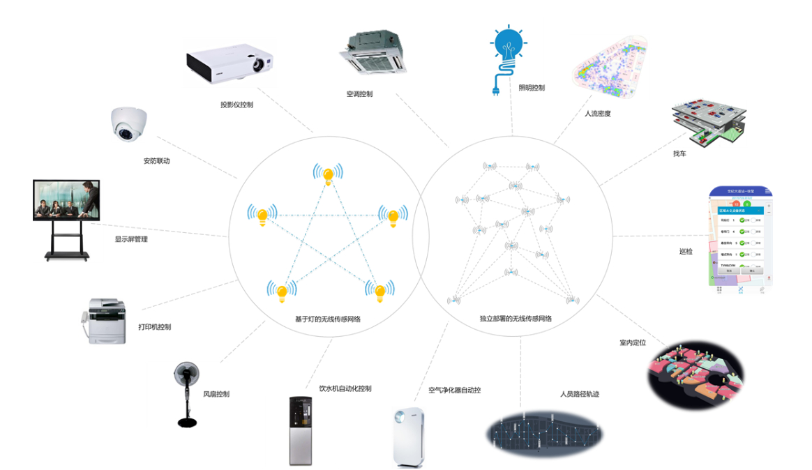 以照明为载体无线感知节点,或者独立部署无线传感网络,实现对建筑物的人/车的实时感知和定位,从而实现对照明、空调、投影仪等设备做到无人自动化管理。比如:有人来自动开灯,没人自动关灯;节假日和加班设置不同的亮灯策略;办公室有人自动开启空调,无人自动关闭空调或者调节到无人的温度;通过室内定位系统实现电子化巡检,后台实时查看人员轨迹,停车场找车,找店铺,找人等;借助无线传感网络还可以晚上布防,发现异常报警,与普通摄像头联动低成本实现安防。